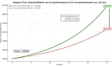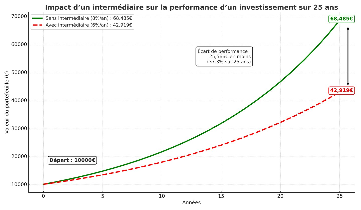 ✅ En plus, leurs solutions sont remplies de frais cachés : frais d’entrée, frais de gestion, frais d’arbitrage… Ces frais répétés réduisent ta performance de près de 40 % en 25 ans !